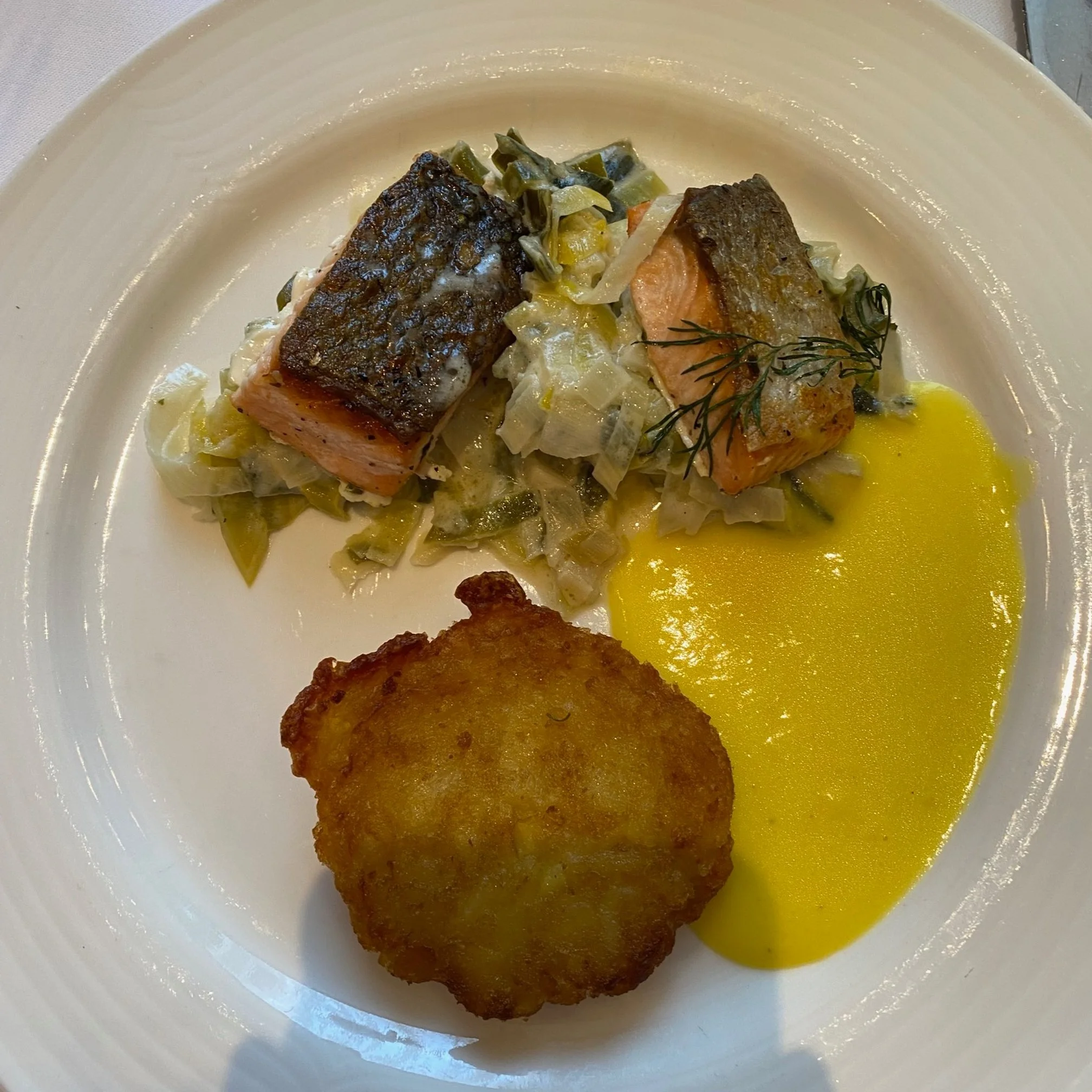 Als Vorspeise habe ich zwei kleine Brote mit Roastbeef und Butter und eine Kürbiscremesuppe gegessen. Da die Kürbiscremesuppe sehr gut geschmeckt hat, musste ich mir sie noch ein zweites Mal holen. Als Hauptspeise habe ich zwei kleine Lachsstücke mit Rösti und Safransoße und danach zwei Stück Serviettenknödel mit Saft ausgesucht.