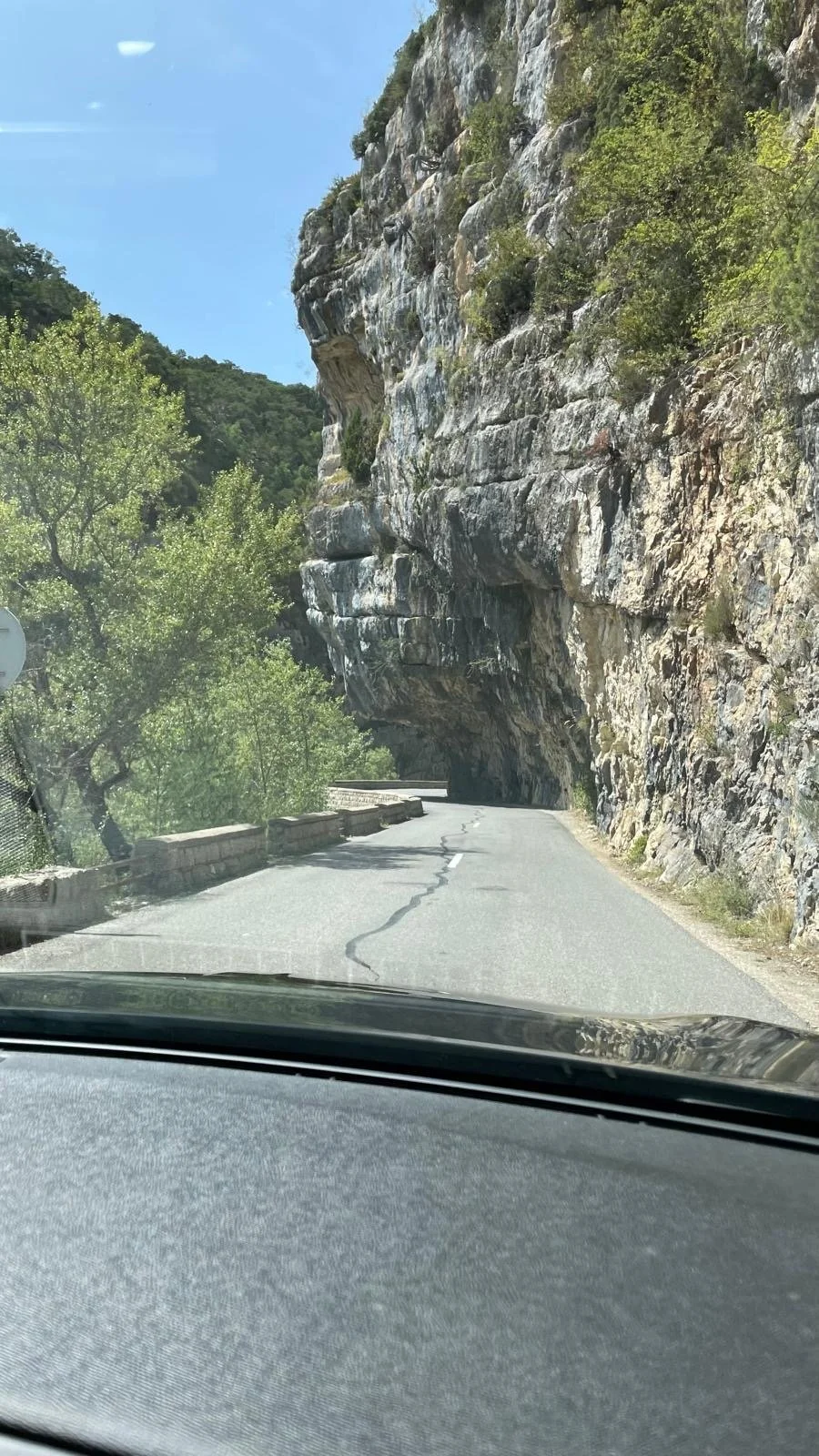 Um auf der „richtigen“ Seite mit dem Auto zu fahren, hatten wir ursprünglich geplant, eine große Runde von der Landstraße weg entlang der Schlucht zu fahren. Wir wussten allerdings nicht, dass ein Teil der Strecke nur einspurig befahrbar war – total eng! - und so mussten wir wieder umkehren. Wir nutzen die Gelegenheit, um unsere Baguettes zu essen, die wirklich köstlich waren!