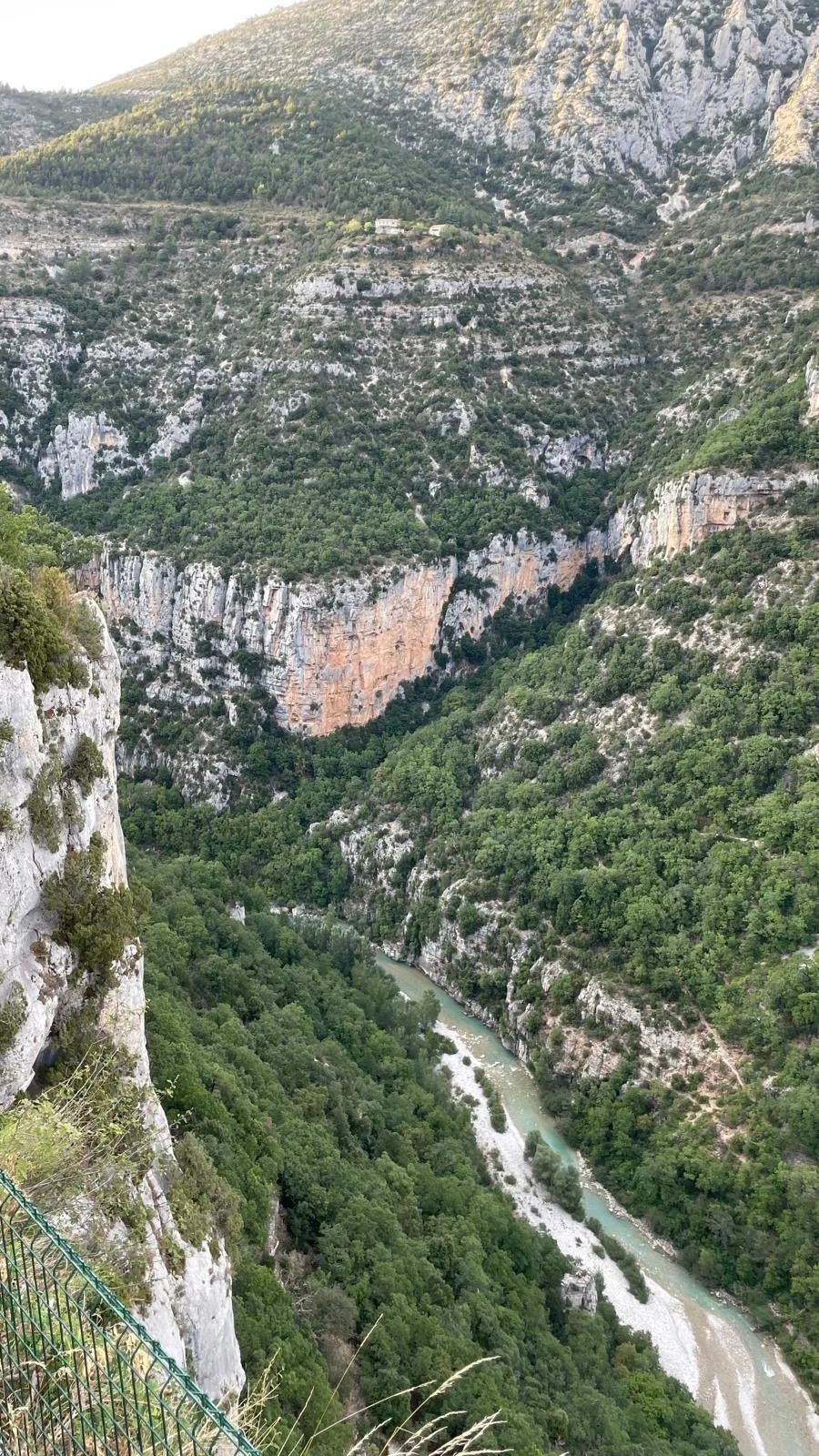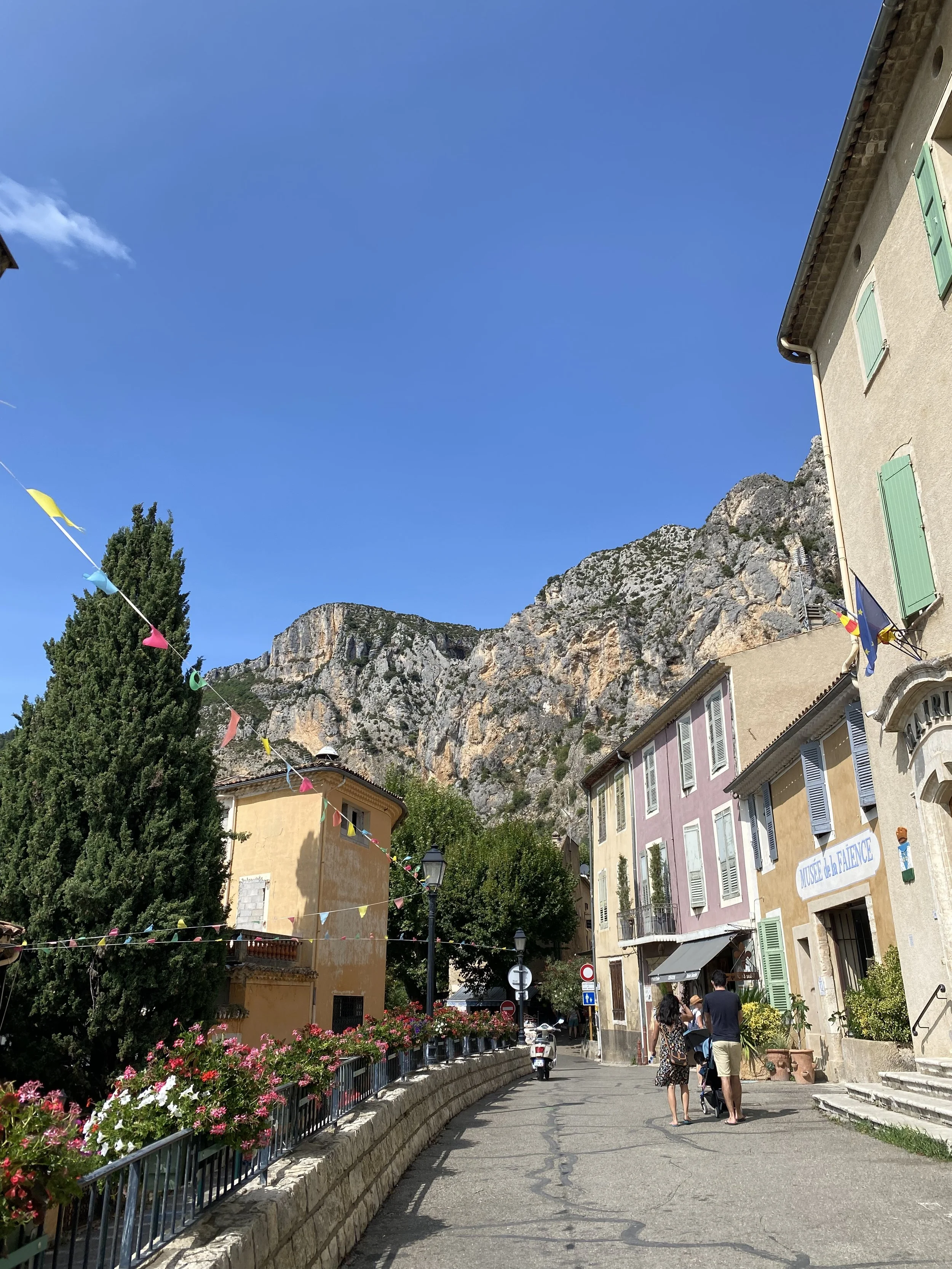 Schließlich kamen wir in Moustiers-Sainte-Marie an und erkundeten das kleine Städtchen. Es liegt direkt an einem hohen Felsen und wird von Bergen umringt. Wir gingen durch die Fußgängerzone, in der es viele Geschäfte und Restaurants gab. Besonders malerisch war der kleine Fluss, der in einer tiefen Klamm mitten durch die Stadt fließt. Um auf die andere Seite zu gelangen, mussten wir eine Brücke überqueren. Es wäre möglich gewesen, zu einer Kirche auf dem direkt in die Höhe ragenden Berg aufzusteigen, doch wir entschieden uns dagegen. Zwischen den Bergen hing ein kleiner Stern, was ich sehr schön empfand. Nachdem wir über die Brücke gegangen waren, entdeckten wir auch dort weitere Geschäfte und Restaurants.