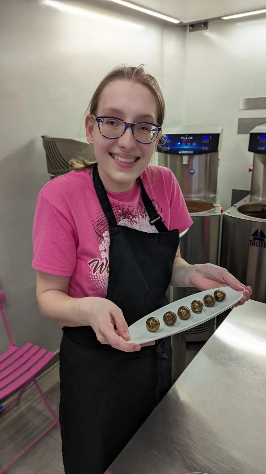 Danach durften wir aussuchen, ob wir Puder in Gold oder in Rot nehmen, um den Pralinen einen Schimmer zu verleihen. Wir haben uns für Gold entschieden. Ich habe mit dem Pinsel das Goldpuder über die Kugeln gestrichen. Dann waren die Pralinen fertig.