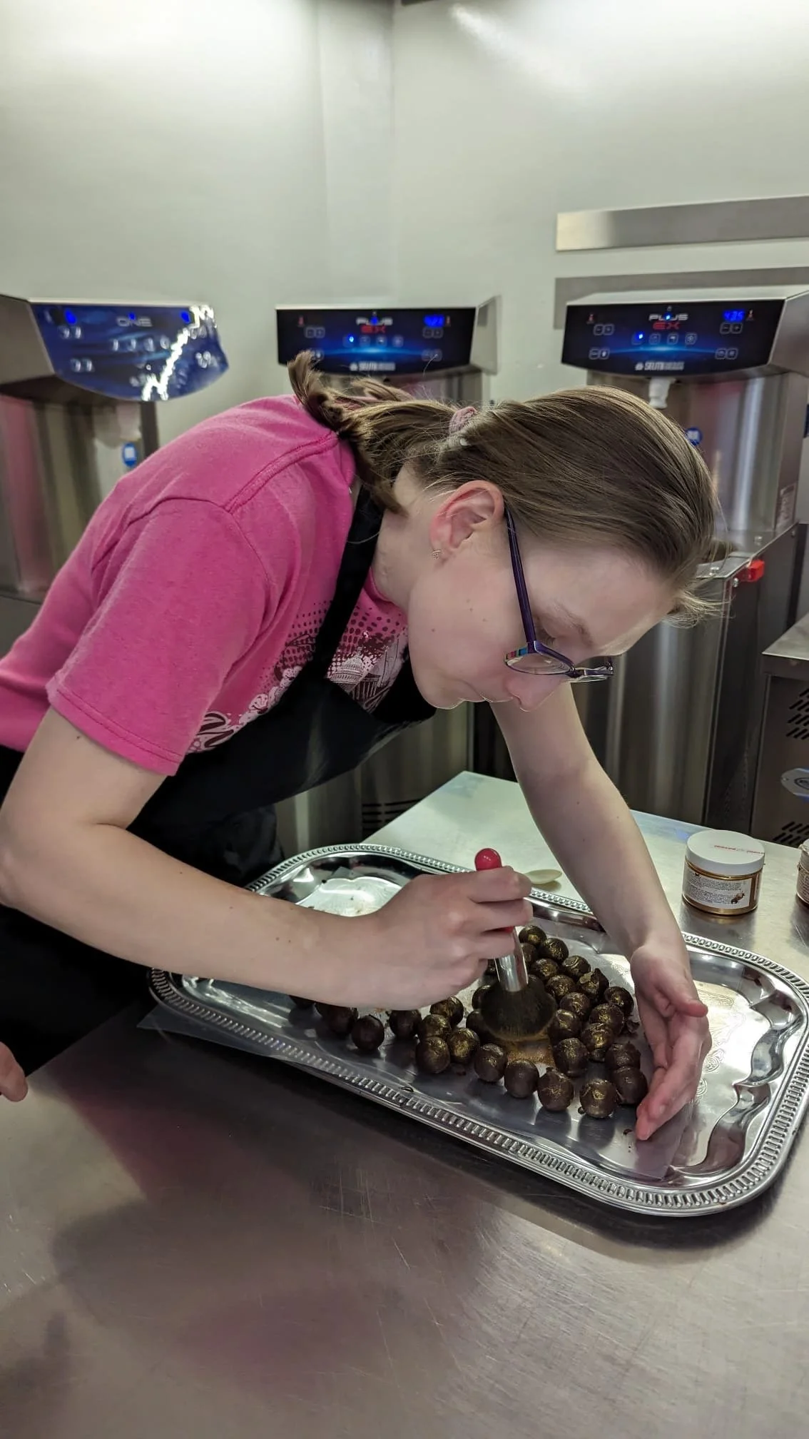 Dann haben wir die Öffnung mit einem kleinen Punkt dunkler Schokolade verschlossen und gerüttelt, damit die Schokolade sich verteilen konnte. Anschließend haben wir die Kugeln kurz in den Kühlschrank gestellt.