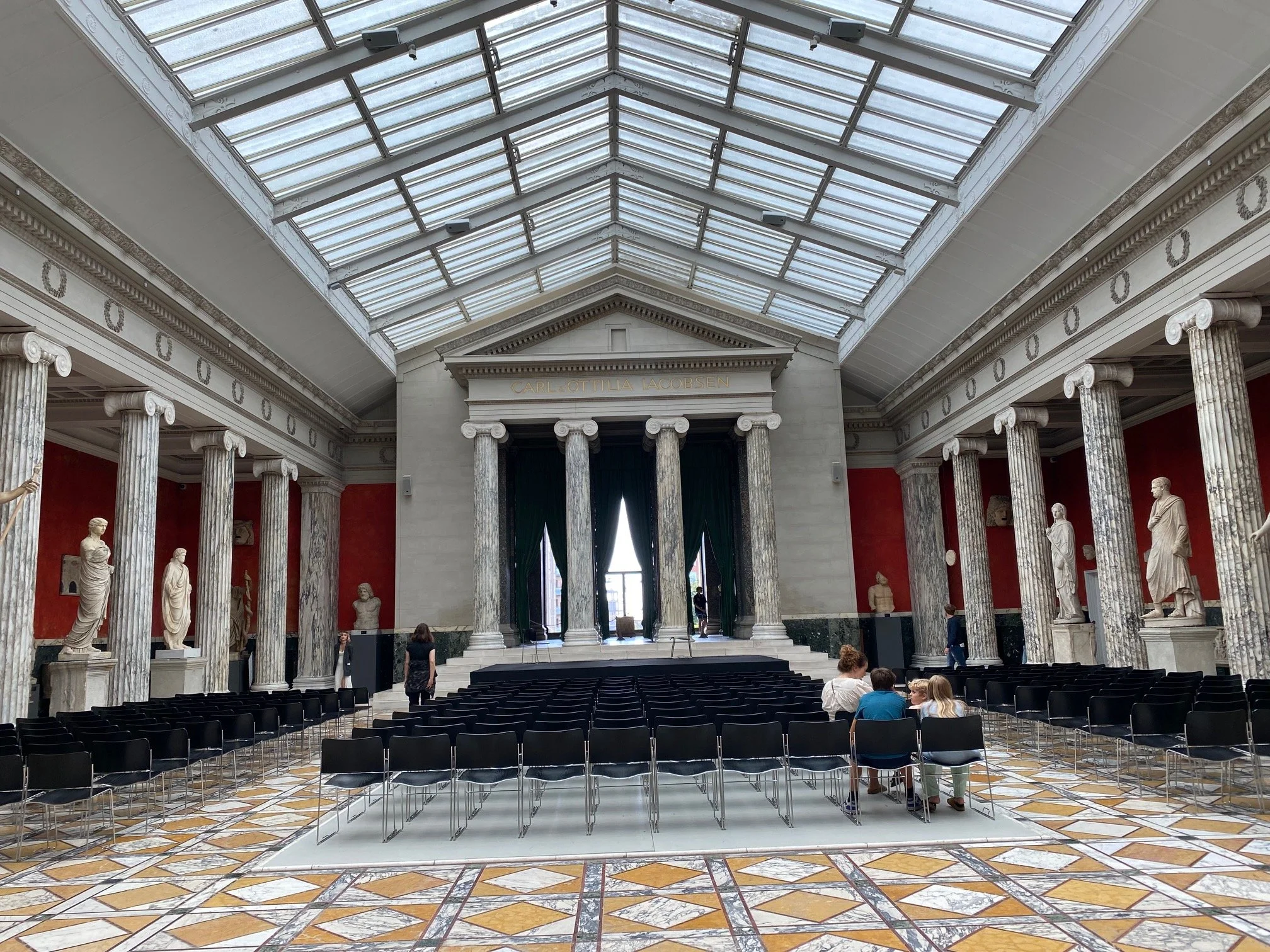 Nach dem Designmuseum sind wir mit der U-Bahn zum Ny Carlsberg Glyptotek Museum gefahren. Dort waren sehr viele römische Skulpturen und Köpfe ausgestellt, es gab sogar eine eigene Vitrine mit lauter abgebrochenen Nasen. In den oberen Stockwerken konnte man französische und dänische Malerei bewundern. In der Mitte des Museums befindet sich ein großer Wintergarten mit Palmen und einem Brunnen, in dem eine Frauenskulptur mit vielen Babys platziert ist. Ich habe die Figuren sehr interessant gefunden.