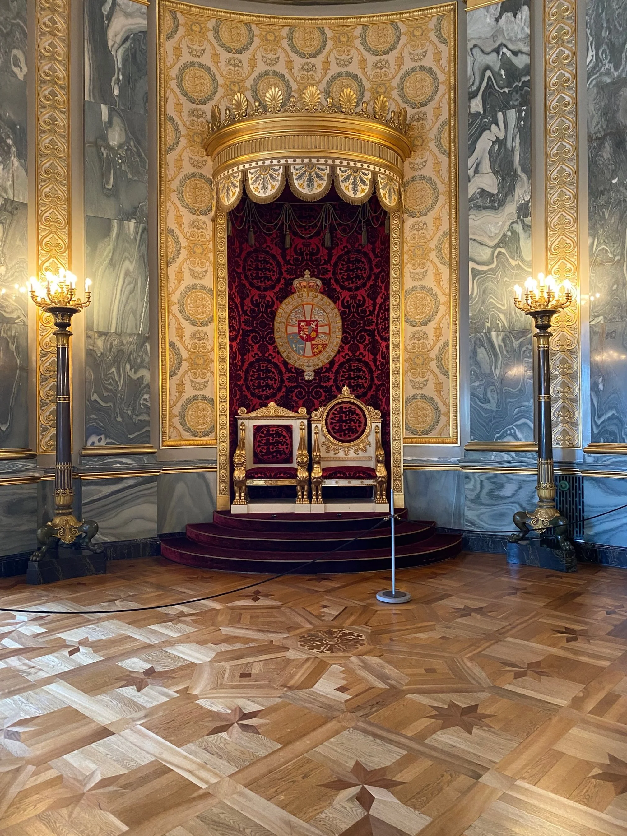Wir gingen durch viele große Räume, einen Speisesaal, eine Bibliothek, einen Festsaal und einen Thronsaal, welche wieder wunderschön gestaltet waren. In einem Saal hingen viele moderne Teppiche an den Wänden, die die Geschichte Dänemarks bis heute zeigten. Die Räumlichkeiten werden heute noch bei Staatsanlässen benutzt.