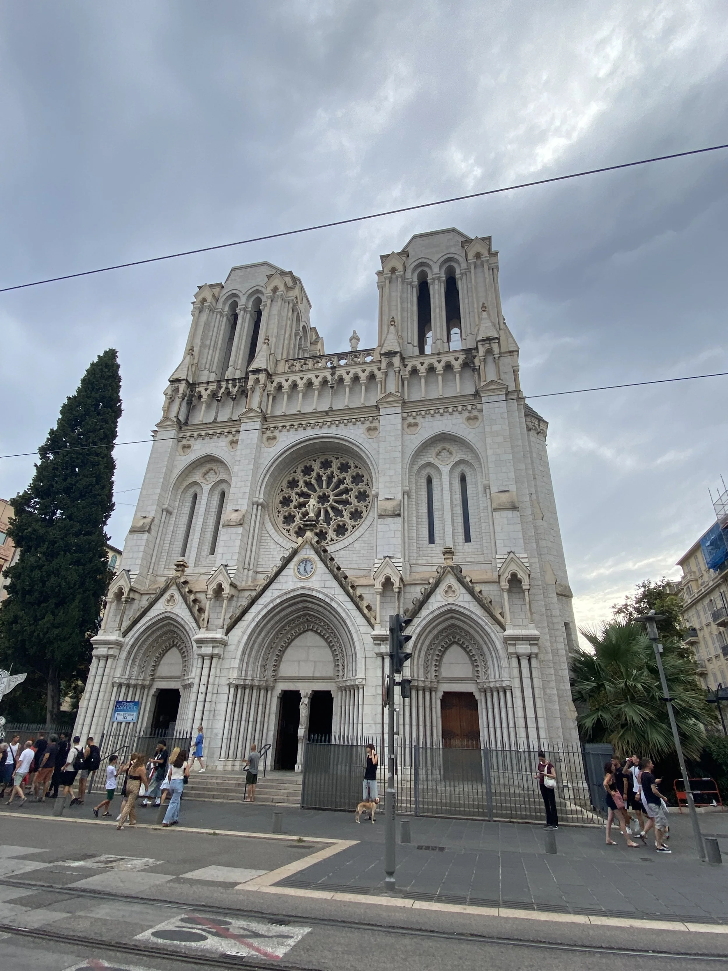 Nachdem wir uns kurz ausgeruht hatten, sind wir zur Kirche Notre-Dame de Nice gefahren. Sie ist groß und innen sehr schön gestaltet. Die Straße vor der Kirche, die Avenue Jean Medecin, war (mehr oder weniger) eine Fußgängerzone mit Straßenbahn. Es war eine sehr lange, breite Einkaufsstraße und wenn man die Straße überqueren wollte, musste man darauf achten, ob gerade eine Straßenbahn kam. Die Straßenbahnen läuteten die Glocke, damit die Leute wussten, dass eine Bahn kommt. So eine Straße hatte ich vorher noch nie gesehen. Anschließend sind wir durch verschiedene Geschäfte gebummelt.