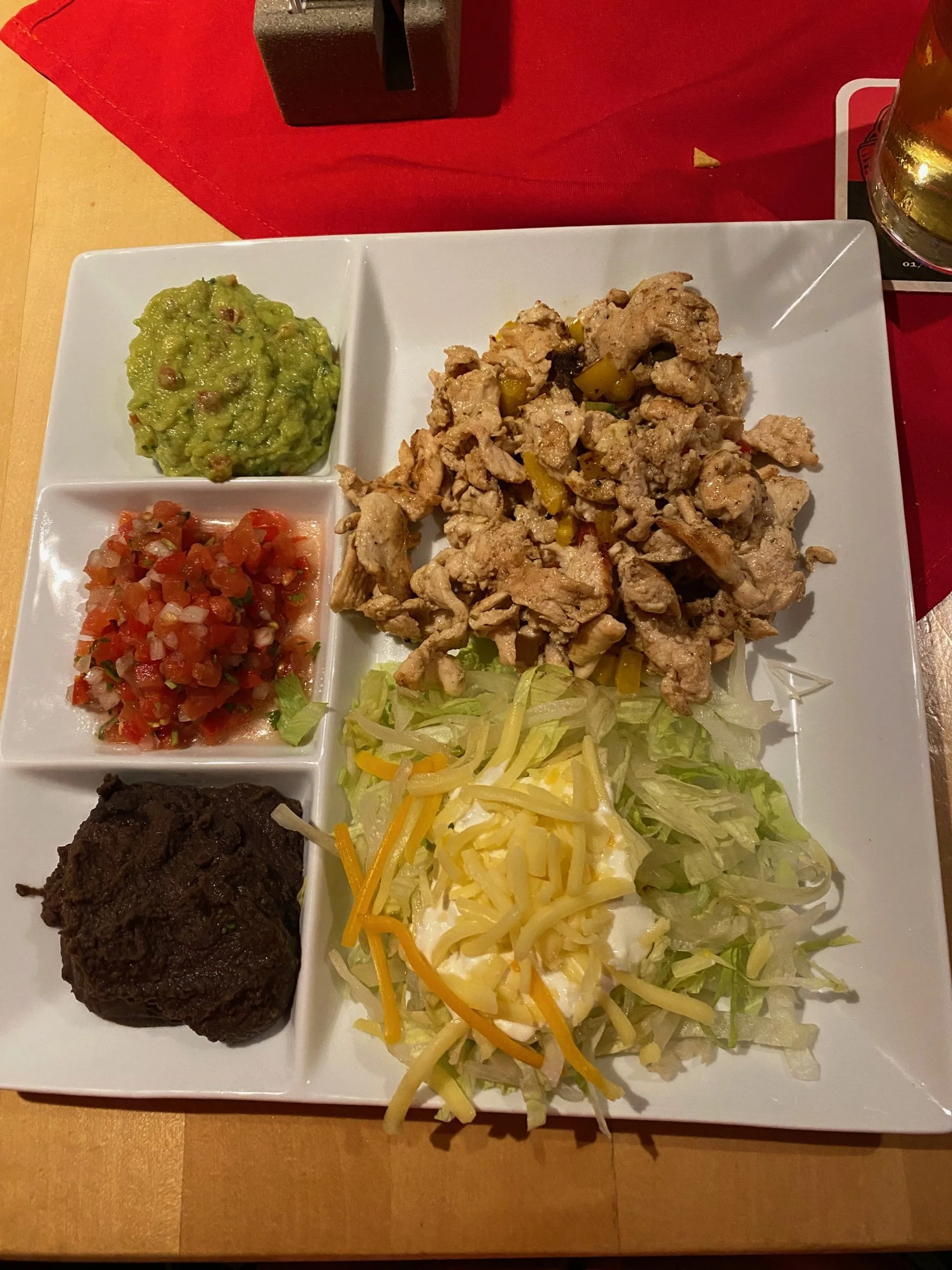 Für die Hauptspeise wählte ich Fajitas mit Hühnerfleisch. Dieses Gericht ermöglichte es, sich seine eigenen Tortillas zuzubereiten. Es gab drei verschiedene Saucen, frischen Salat, Käse, Sauerrahm und zartes Hühnerfleisch, das man nach Belieben in Weizentortillas einwickeln konnte. Am Anfang wusste ich nicht, ob man die Tortillas mit den Händen oder mit Besteck essen sollte, aber ich entschied mich sie in die Hand zu nehmen, weil es für mich einfacher war. Der Teller war nämlich so voll, dass es keinen Platz mehr gab, die Tortillas hinzulegen und zu befüllen. Trotzdem war es für mich ungewohnt, in einem Lokal mit der Hand zu essen.