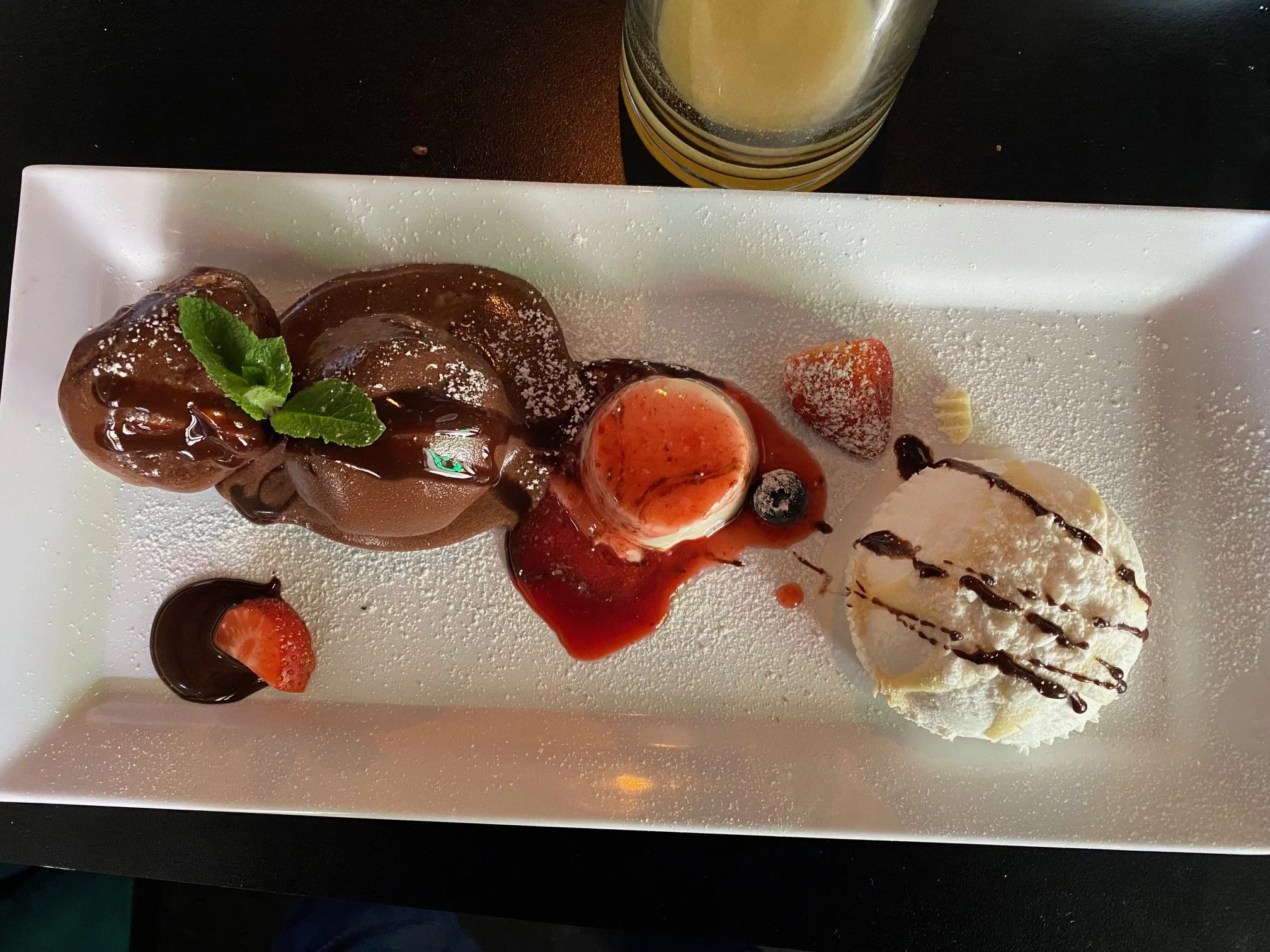 Als Vorspeise gab es für alle drei große schwarze Teller mit Schinken, Käse, Mozzarella, Mango, Thunfisch, Pizza Stangel und Pizza Brot. Wir haben Einiges probiert, aber es ist doch etwas übriggeblieben. Als Hauptspeise habe ich eine Pizza Cardinale bestellt, die mir sehr gut geschmeckt hat. Als Nachspeise wurden auf einem langen eckigen weißen Teller drei Desserts serviert: eine mit Kaffeeeis gefüllte Kugel, Profiteroles und Panna Cotta. Die Tagestrainerin war so nett und hat uns auf die Vorspeise und die Nachspeise eingeladen. Wir mussten nur das Getränk und die Hauptspeise selber bezahlen.