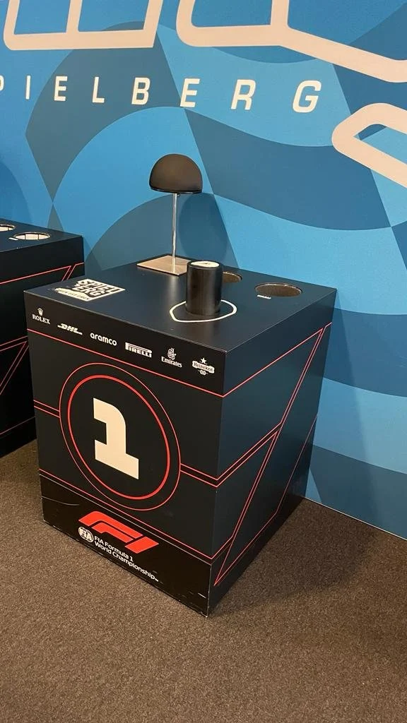 Daneben befindet sich ein Raum für die Moderatoren, und danach der Cooling Down Raum. Dort stehen drei Boxen, die man während Corona für die Siegerehrung gebraucht hat, weil man Abstand halten musste und nicht gleichzeitig aufs Podest konnte.