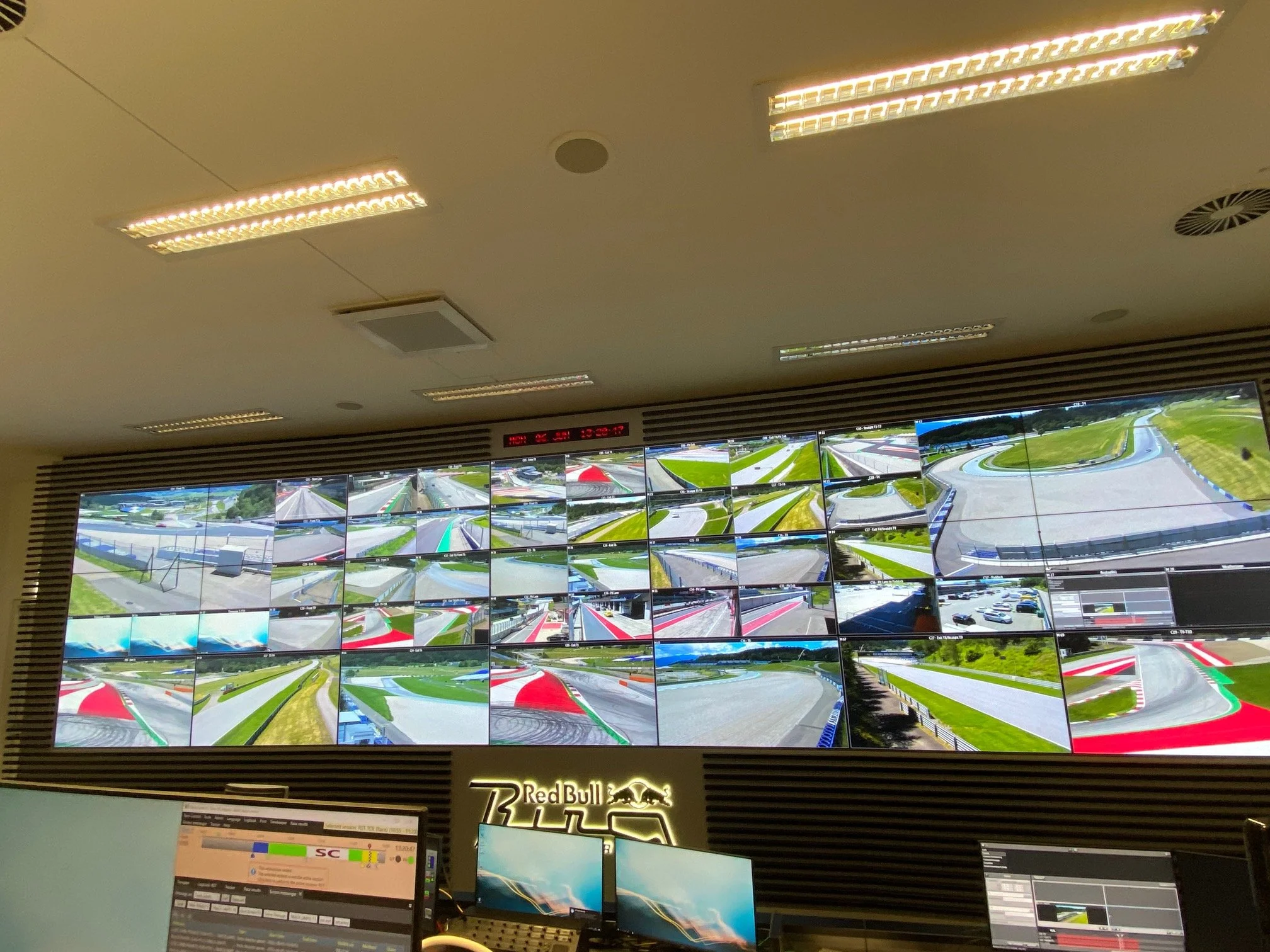 Zum Schluss haben wir den Raum der Rennleitung angeschaut, in dem sich eine riesige Monitorwand mit unzähligen Bildschirmen befindet. Über viele Kameras wird die gesamte Rennstrecke überwacht.