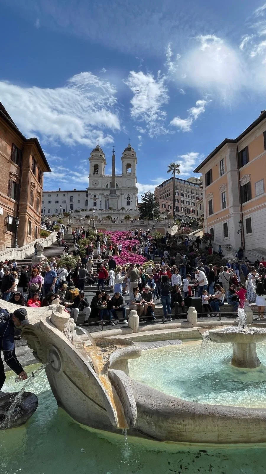 Auf der Spanischen Treppe standen sehr viele große Blumentöpfe mit hell- und dunkelrosa Blüten, was ich sehr schön fand. Allerdings befanden sich ebenso viele Touristen auf der Treppe und die Polizei passte auf, dass sich niemand auf die Stufen setzte, damit sich nicht zu viele Personen auf einmal dort aufhalten.