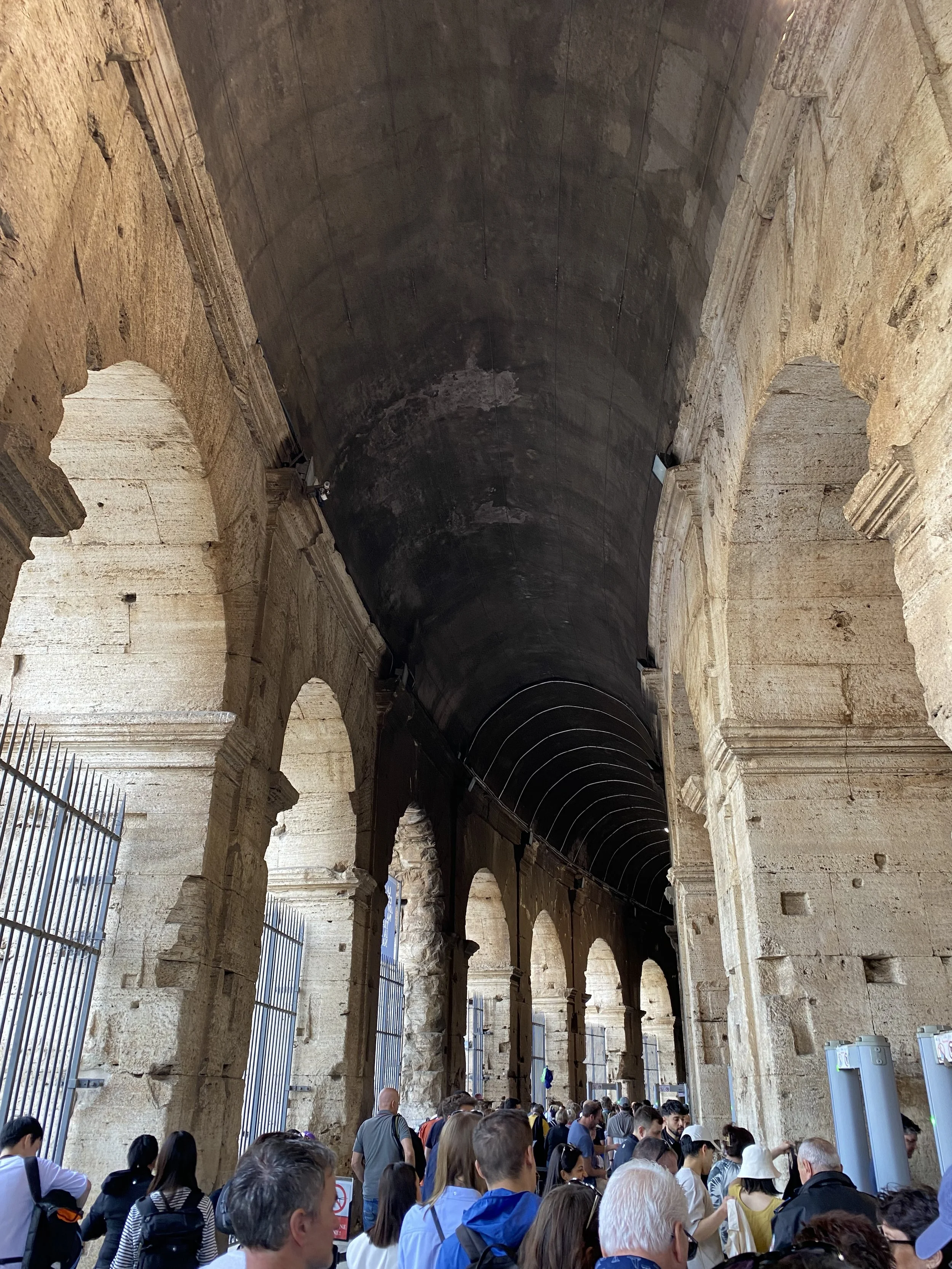 Am Sonntag sind wir mit dem Bus zum Kolosseum gefahren. Als wir angekommen sind, waren schon sehr viele Touristen da und wir mussten zuerst einmal den Eingang suchen. Wir fanden ihn relativ schnell, da es lange Schlangen vor den Eingängen gab. Wir hatten wieder Tickets gekauft, allerdings konnte man Tickets für behinderte Personen nicht vorab kaufen. Wir zeigten meinen Behindertenausweis und mussten zuerst durch eine Kontrollstation durchgehen. Der Italiener am Eingang war nett, und erklärte uns, dass wir am Schalter das richtige Ticket bekämen. Da ich CIs habe, musste ich gar nicht durch den Metalldetektor durchgehen, sondern konnte außen herumgehen. Wir waren ein bisschen zu früh dort, aber es war kein Problem, weil wir noch die richtigen Tickets für mich und eine Begleitperson besorgen mussten.