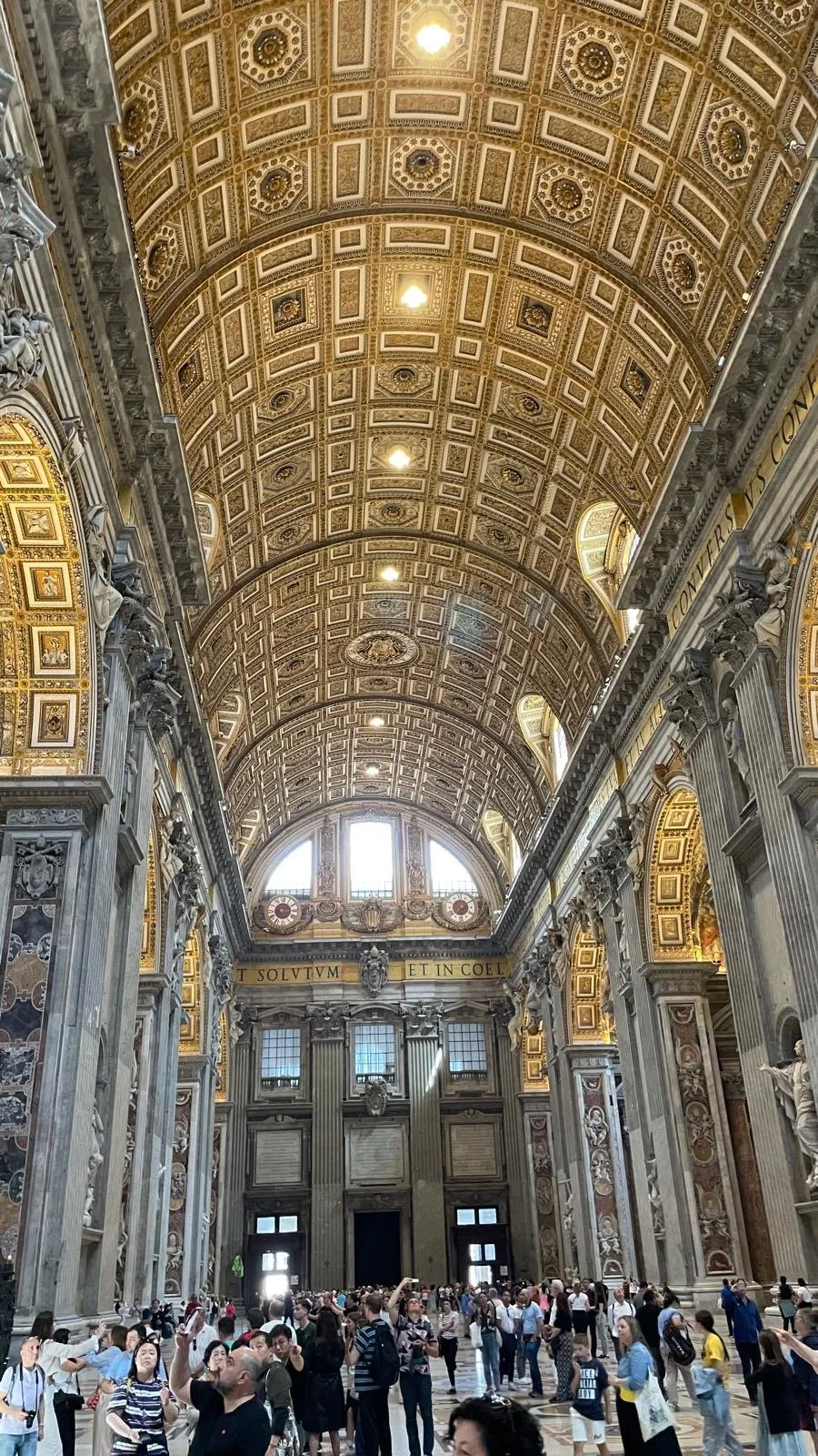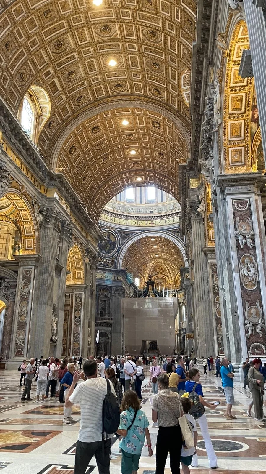 Gott sei Dank konnten wir wieder an der Schlange vorbeigehen, die bis auf die andere Seite des Petersplatzes reichte. Nun standen wir vor dem Petersdom, der wirklich unglaublich groß war. Drinnen waren alle Wände mit Marmor und Gold verziert, es gab viele Gemälde, Statuen und natürlich kirchliche Gegenstände. Auffällig war, dass es keine Sessel und Bänke gab. Ich habe noch nie so eine riesige Kirche gesehen!