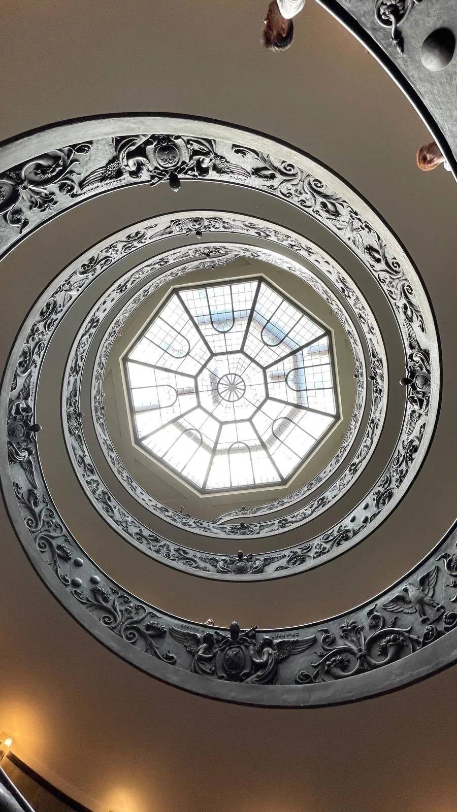 Als wir in den Gängen aus den Fenstern schauten, sahen wir, dass es auch schöne Gärten im Vatikan gab. Am Ende der Museen gab es natürlich wieder einen Shop. Zum Ausgang gingen wir über eine breite Wendeltreppe hinunter. Ich fand es sehr hilfreich, dass im Museum die meisten Stufen mit Streifen gekennzeichnet sind, damit ich sie besser sehen kann.