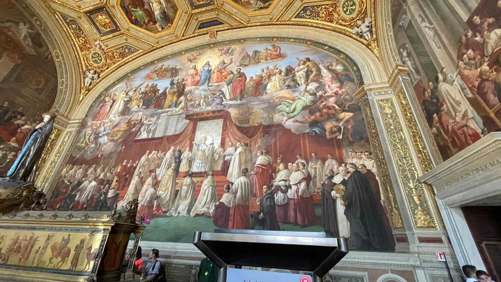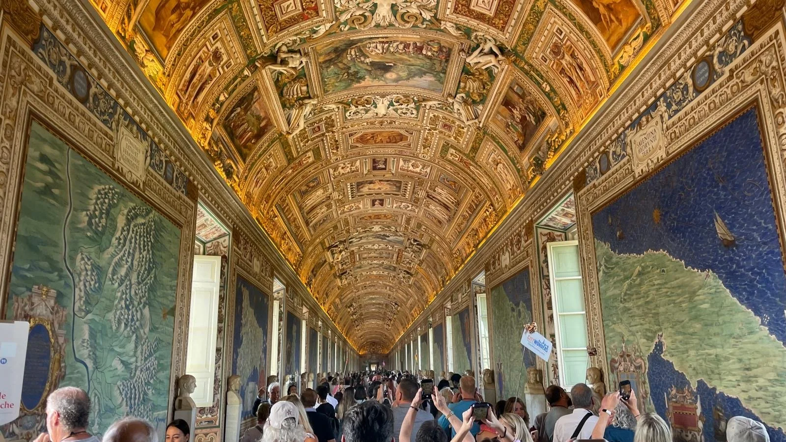 Der Höhepunkt der Vatikanischen Museen ist natürlich die Sixtinische Kapelle. Sie ist an den Wänden und an der Decke komplett mit traumhaft schönen Bildern bemalt. Eigentlich darf man dort keine Fotos machen, aber aufgrund meiner Sehbehinderung brauche ich das Handy dazu, um die Decke mit der Kamera zu vergrößern. Da haben wir einen Mitarbeiter gefragt und ihm meine Blindenschleife gezeigt. Er hat zugestimmt und so konnte ich mit der Kamera besser die Decke sehen.